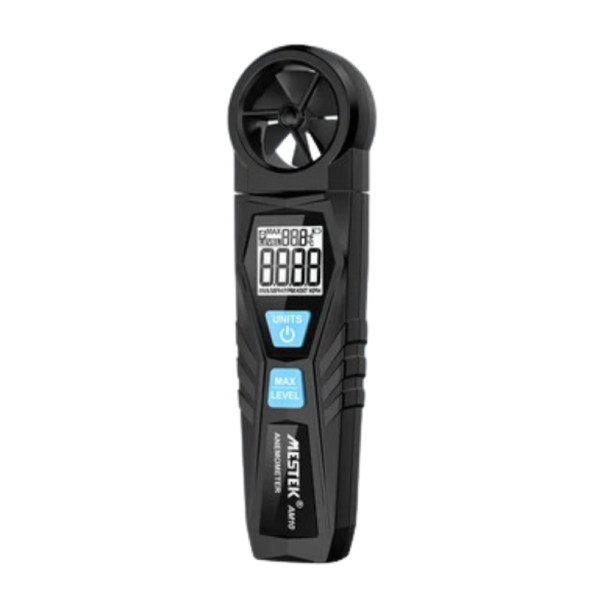 El Anemómetro Digital AM10 de Mestek es una herramienta portátil de alta precisión para medir la velocidad y la temperatura del viento. Este dispositivo puede medir velocidades de viento de 0.3 a 30 m/s con una precisión de ±(3.0% + 0.3 m/s) y ofrece cinco modos de medición que permiten adaptarse a diferentes escenarios de uso. Su diseño incluye una pantalla LCD retroiluminada que facilita la lectura en condiciones de baja luminosidad y es adecuado para una variedad de aplicaciones, desde climatización hasta actividades al aire libre como la navegación y el vuelo de drones.