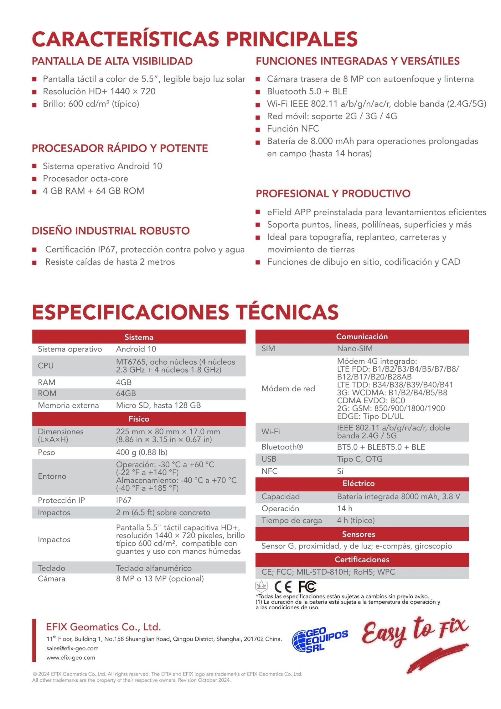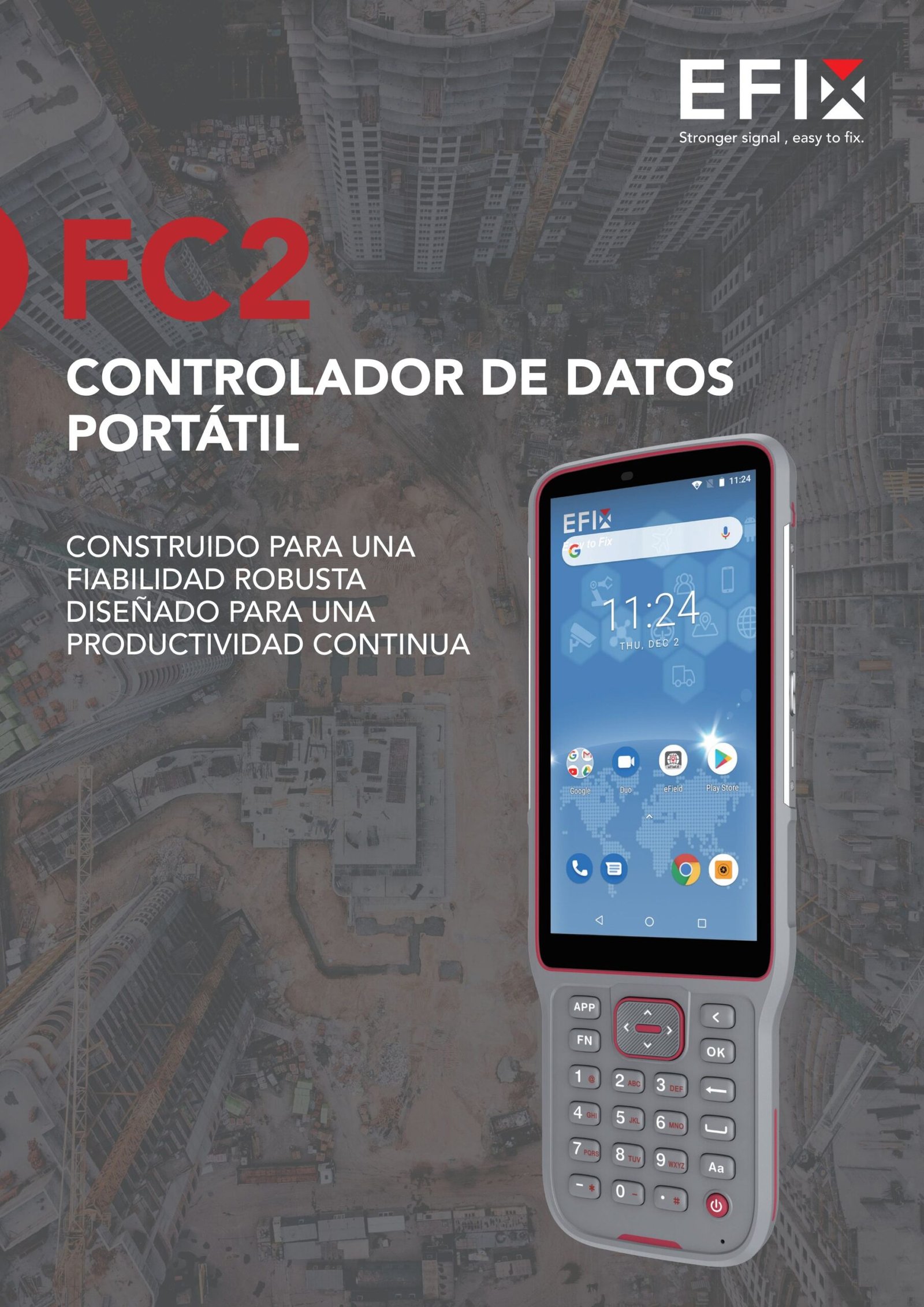 Controlador de datos portátil diseñado para trabajo en campo, con estructura robusta y operación confiable en entornos exigentes. Permite trabajar con seguridad frente a polvo, humedad y condiciones variables, manteniendo un desempeño estable durante la jornada.