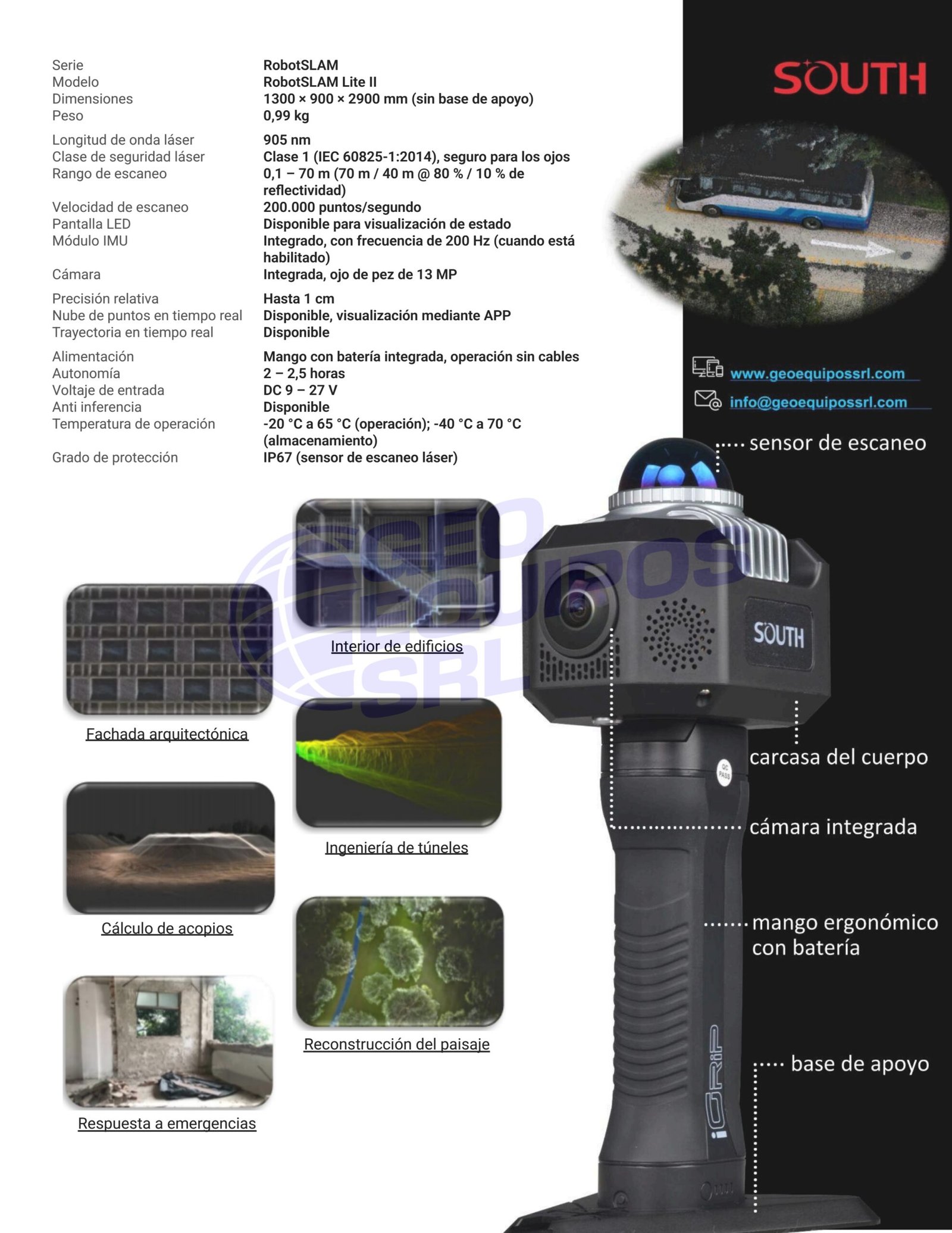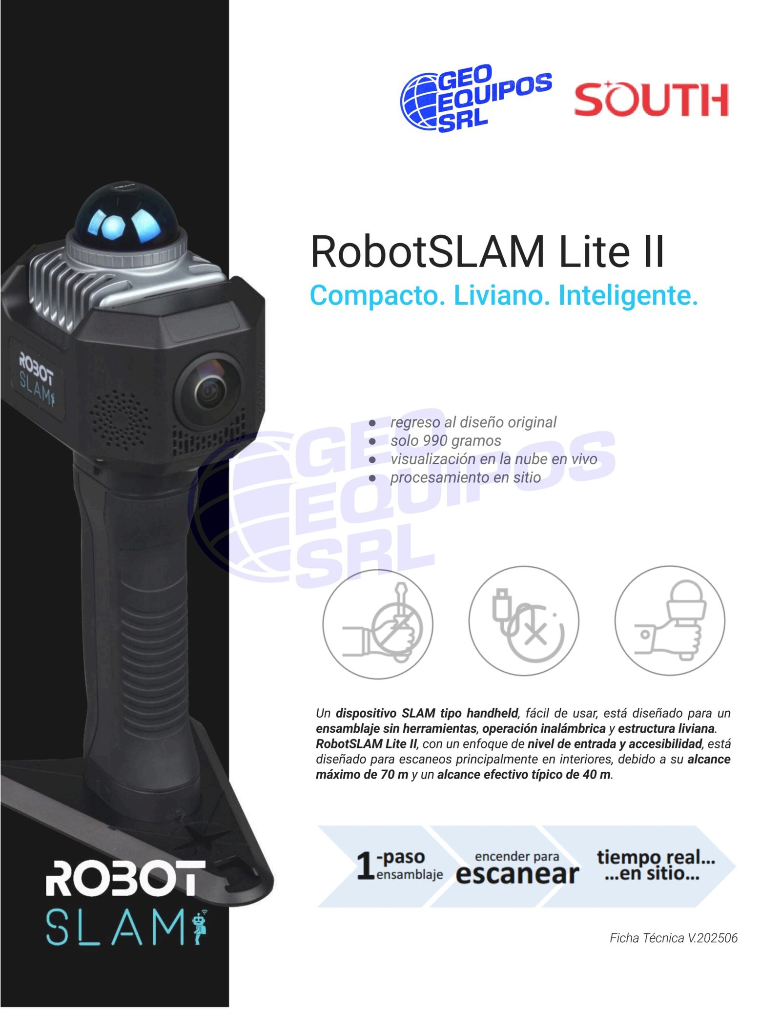 El RobotSLAM Lite II es un escáner SLAM portátil, compacto y liviano, diseñado para levantamientos rápidos en interiores. Su operación sin cables, visualización en tiempo real y procesamiento en sitio lo convierten en una solución práctica y accesible para escaneos 3D eficientes.