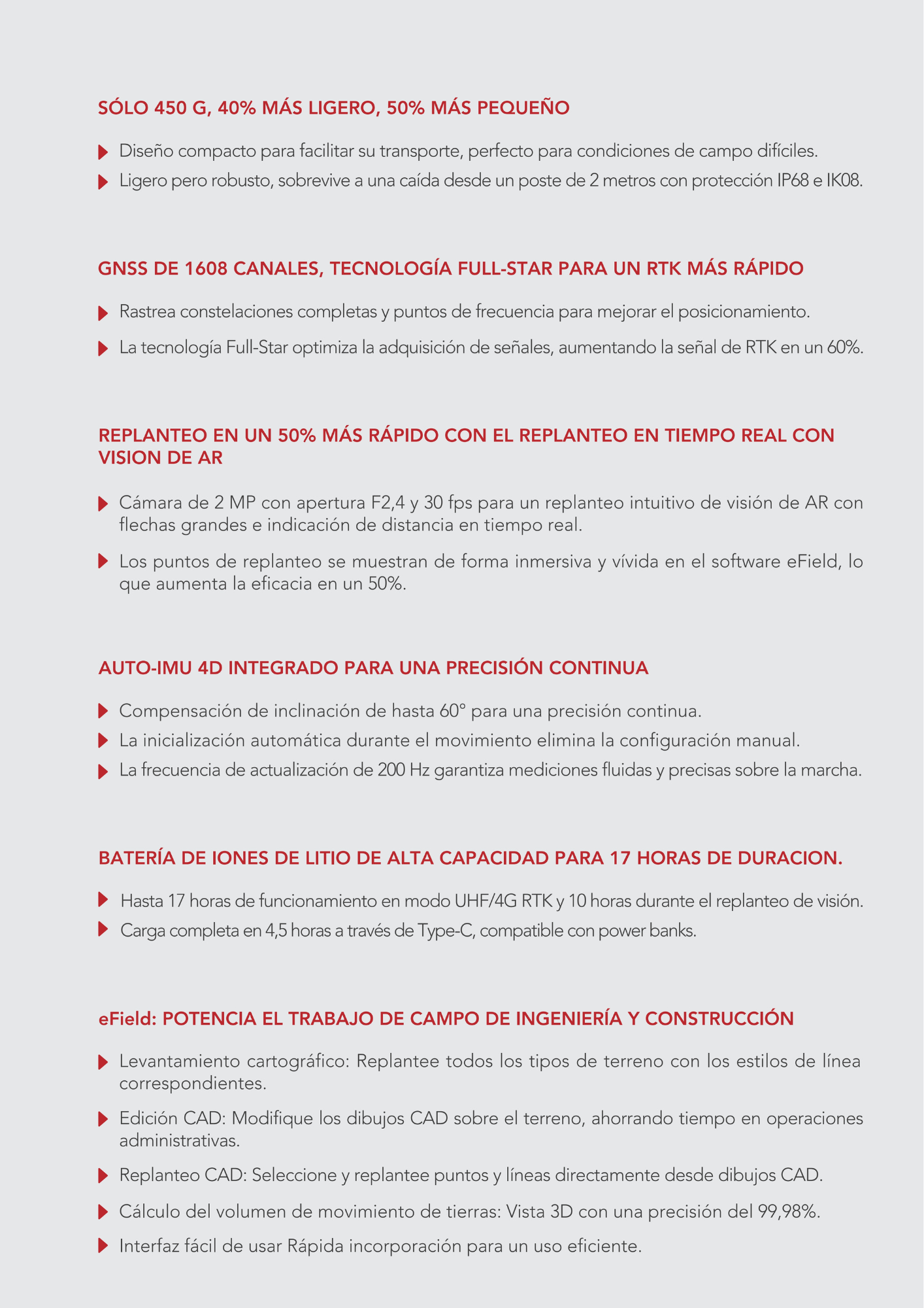 Gracias a su replanteo con visión de AR en tiempo real y su motor RTK avanzado, permite trabajar de forma más rápida e intuitiva, aumentando la eficiencia del replanteo hasta en un 50%. Es una solución ideal para topografía e ingeniería que buscan portabilidad, rapidez operativa y precisión constante en un equipo compacto.
