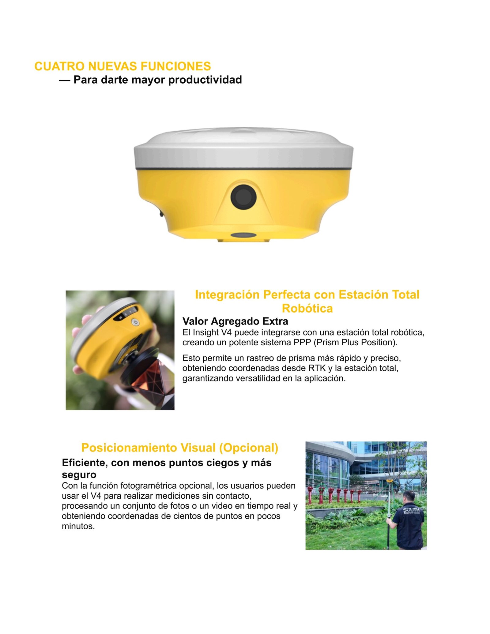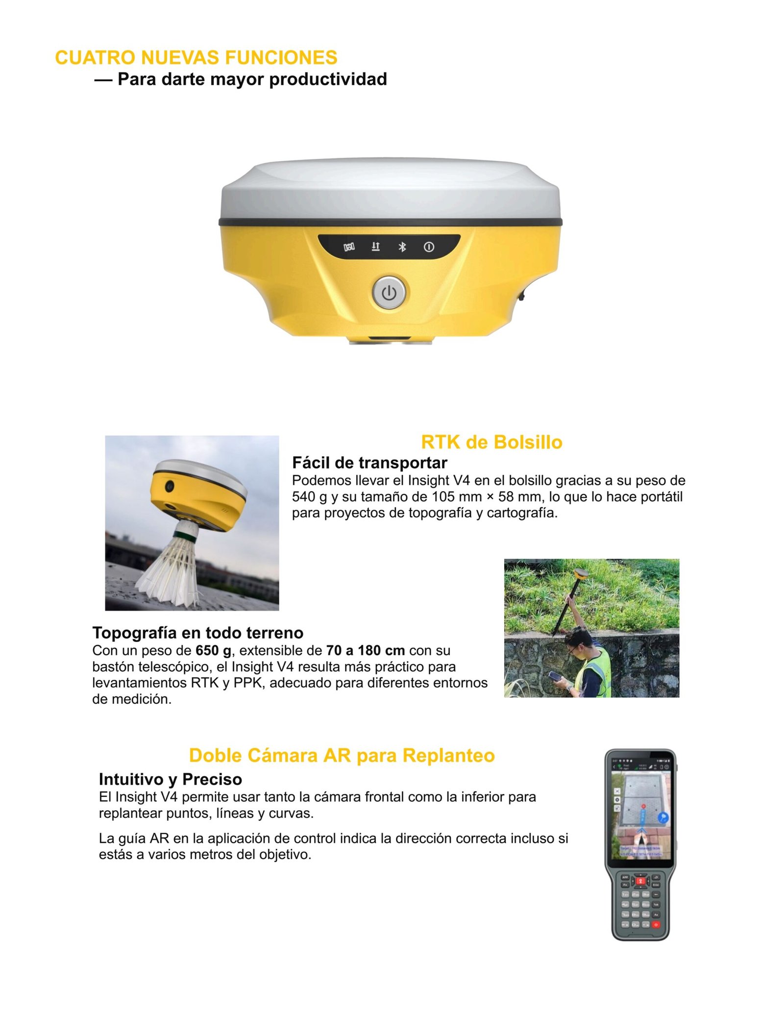 Compacto, resistente y fácil de transportar, el Insight V4 está diseñado para brindar máxima eficiencia en levantamientos topográficos y geodésicos. Incorpora un sistema de replanteo AR con doble cámara, una IMU de quinta generación y un motor S805 de 1698 canales, garantizando alta estabilidad y precisión en cualquier entorno. Con solo 540 g de peso, una batería de hasta 20 horas de duración y protección IP68, ofrece un rendimiento confiable bajo condiciones extremas. Ideal para profesionales que requieren un equipo versátil, preciso y listo para todo tipo de terreno.